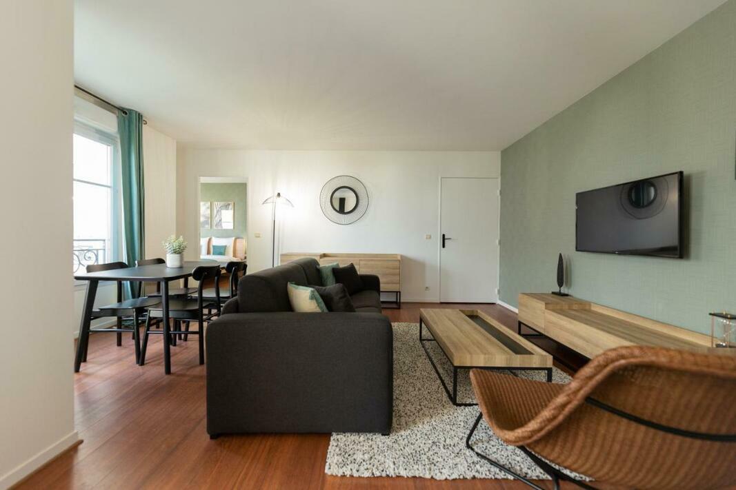 The 1-bedroom apartment features a living room with flat-screen TV, and a fully equipped kitchen.