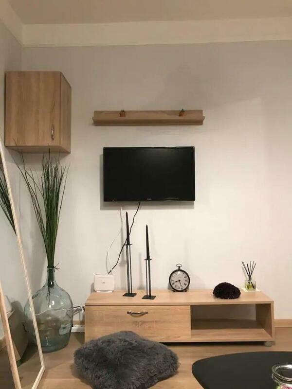 The apartment has 1 bedroom, a flat-screen TV, an equipped kitchen with a fridge and an oven, a washing machine, and 1 bathroom with a shower.