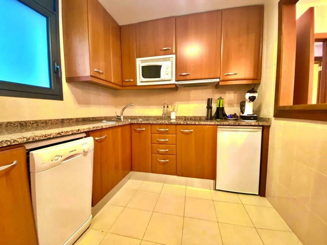 The 2-bedroom apartment is fitted with a living room with flat-screen TV, and a fully equipped kitchen.