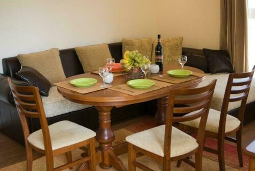 2 dormitoare: unul dintre ele are două paturi de o persoană, iar celălalt are un pat dublu, uși adiacente, o cameră de zi cu o canapea extensibilă și o zonă de bucătărie - chiuvetă, hota de extractie, ceainic electric, prăjitor de pâine, aragaz, cuptor cu microunde, frigider , vase, tacâmuri, masă cu scaune; Max. 6 persoane, 80 m2.