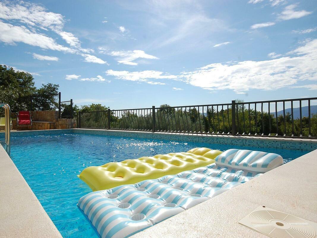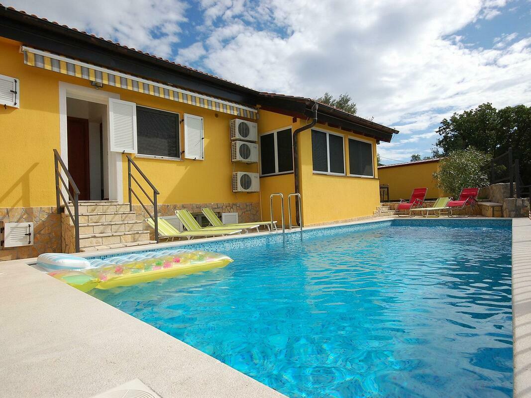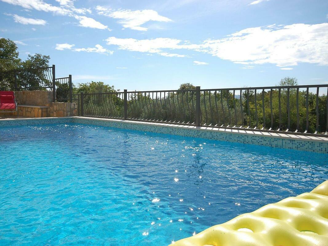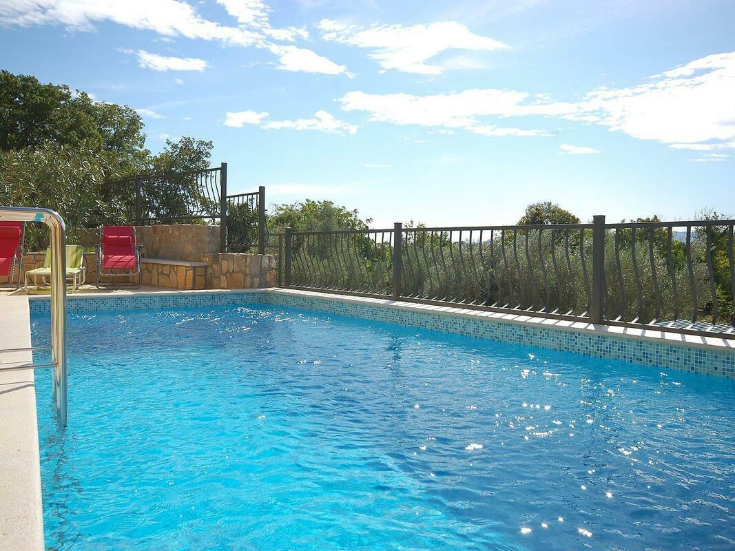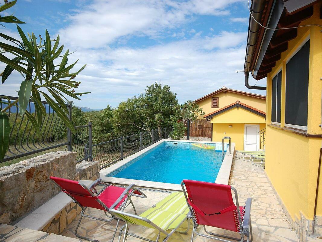 New, child friendly, modern detached house "Malnar Emira", built in 2010, surrounded by trees. House Equipment: air conditioning, washing machine (private use). Access & Parking: private parking. All-season motor access to the house. Situation: on the outskirts of Krk, in the district of Skrbcici, secluded, quiet position at the edge of the forest. View from the apartment of the garden and the forest. Surroundings of the house: grounds (private use, fenced), swimming pool (private use, length 7 m x width 4 m, open from 04.07. untill 01 .10.), outside shower (private use), barbecue (private use). Facilities and distances: shop 12 km, grocers 400 m, supermarket 1.2 km, restaurant 400 m, shingle beach 2 km, bathing bay 2 km, pebble beach 2 km, rocky beach 2 km, sports centre 12 km, tennis 12 km. Please note, nearby is a main road in 1 km. 4-room house, detached, for 6 people, 115 m2 on 2 levels, modern furnishings. Living/dining room with satellite TV, DVD, hi-fi system and dining-table. Smoking allowed. Internet (Wireless LAN [WLAN]). Sleeping room with 1 double bed. Sleeping room with 1 double bed. Sleeping room with 1 double bed. Kitchenette with 4 hot plates, micro wave, oven, dining table, dishwasher, fridge and deep freezer. Shower, shower/WC and separate WC. Terrace, patio, terrace furniture, 6 deck chairs. Other equipment: washing machine. Mandatory Fees paid on arrival: Breakage deposit in cash - 300.00 EUR fixed price Local tax - 0.15 EUR per person/day enrollment / registration fee - 4.00 EUR per person