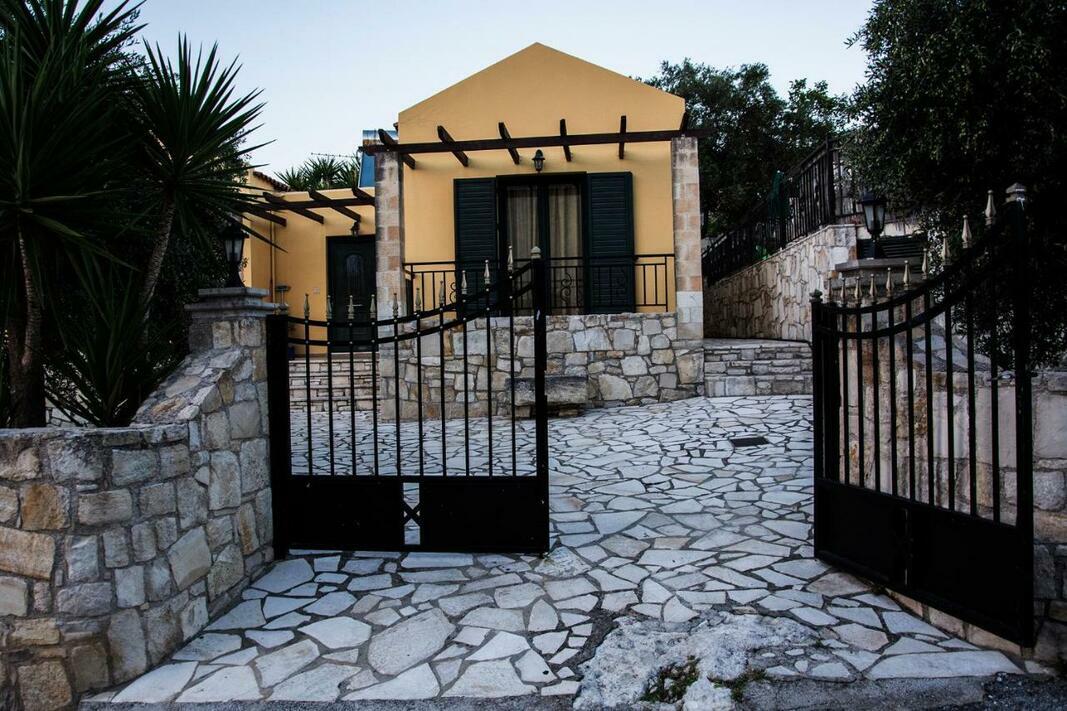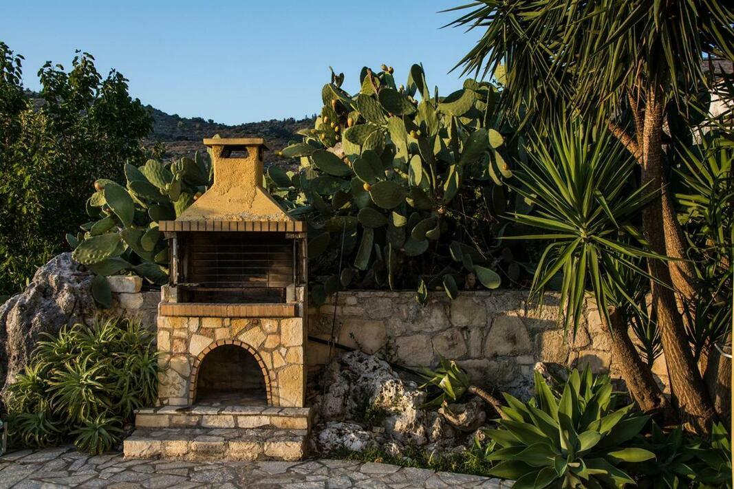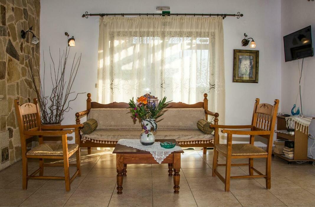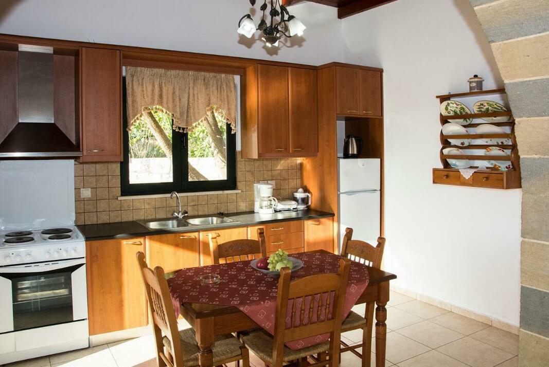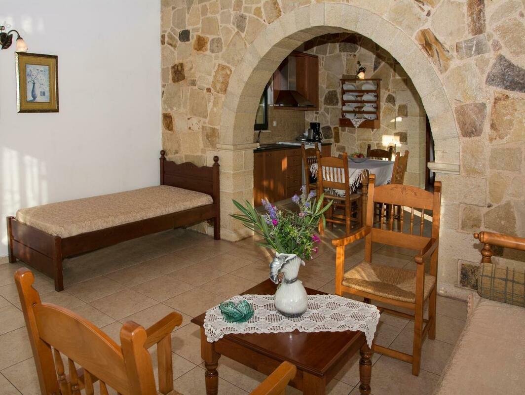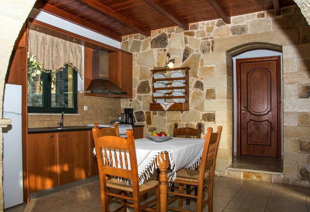 A country-style kitchen with stone walls, stove and dining area is provided. The air-conditioned Villa Manos is equipped with a satellite TV and a seating area with a traditional sofa.