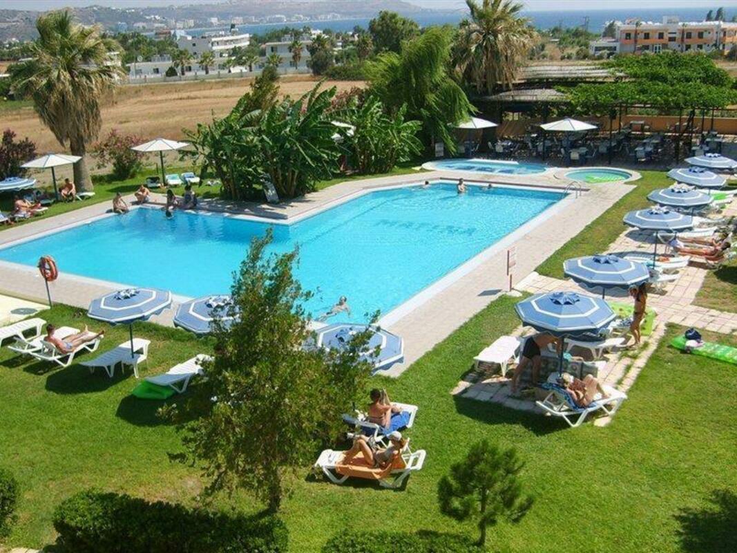 The hotel is situated on the outskirts of Faliraki providing the perfect setting for relaxation and an atmosphere of unhurried comfort. A short walk from the hotel will take you to the lively resort centre and to one of the best golden sandy beaches on the island. This resort is considered one of the most cosmopolitan summer resorts in Rhodes. It is located just 12 km from the island's capital and is notable for its remarkable tourist infrastructure. Thousands of tourists visit here every year. Restaurants, bars, exciting nightlife (there are many famous clubs in the area), shopping opportunities and the bus station can all be found in the vicinity. Sight-seeing attractions in the area include the archaeological site in Sarandapihos. Located close to village Kalithies, it is believed to be part of the acropolis from archaic times. Other archaeological highlights include Erimokastro, located near the sea with ruins of the archaic wall, and the old monastery of Prophet Amos on a hill just outside Faliraki.Facilities