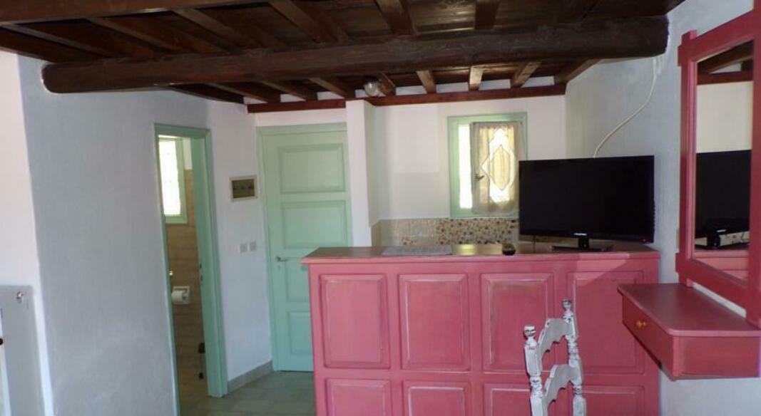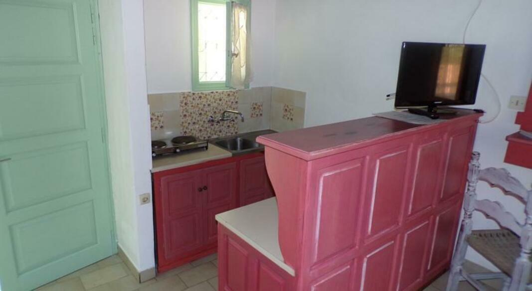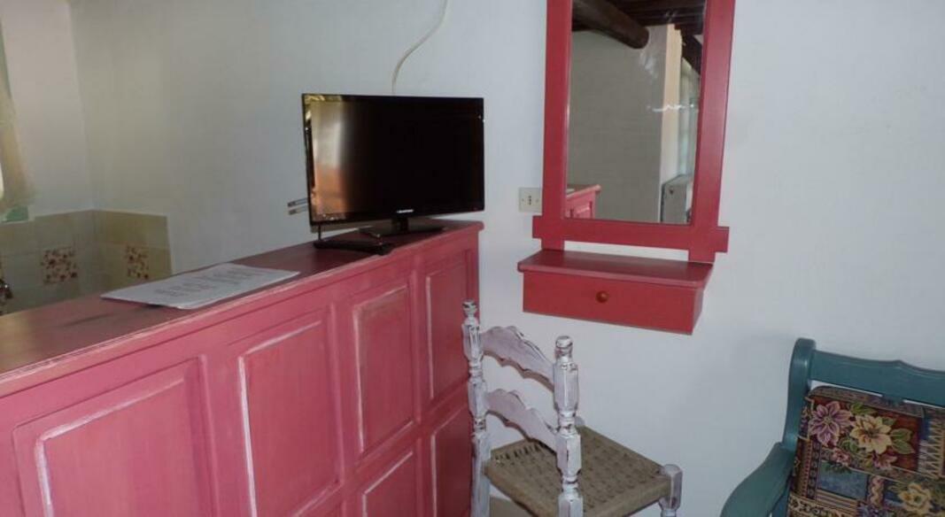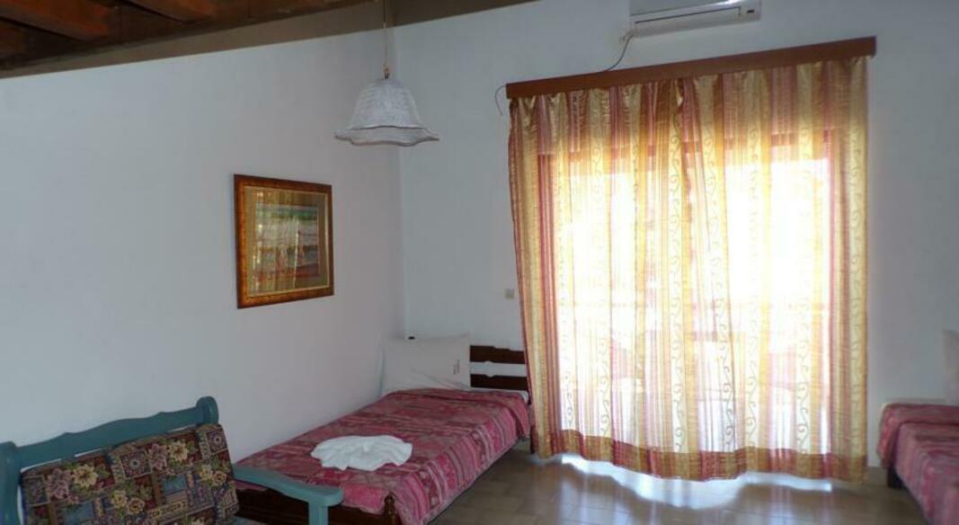 Rooms are traditionally styled with wood furnishings and tiled floors. Each is spacious with seating area, and comes with a kitchenette with fridge.
