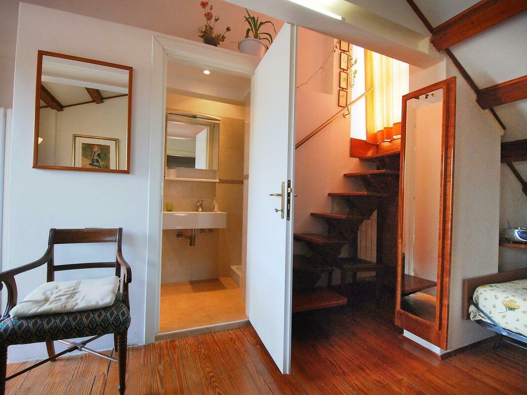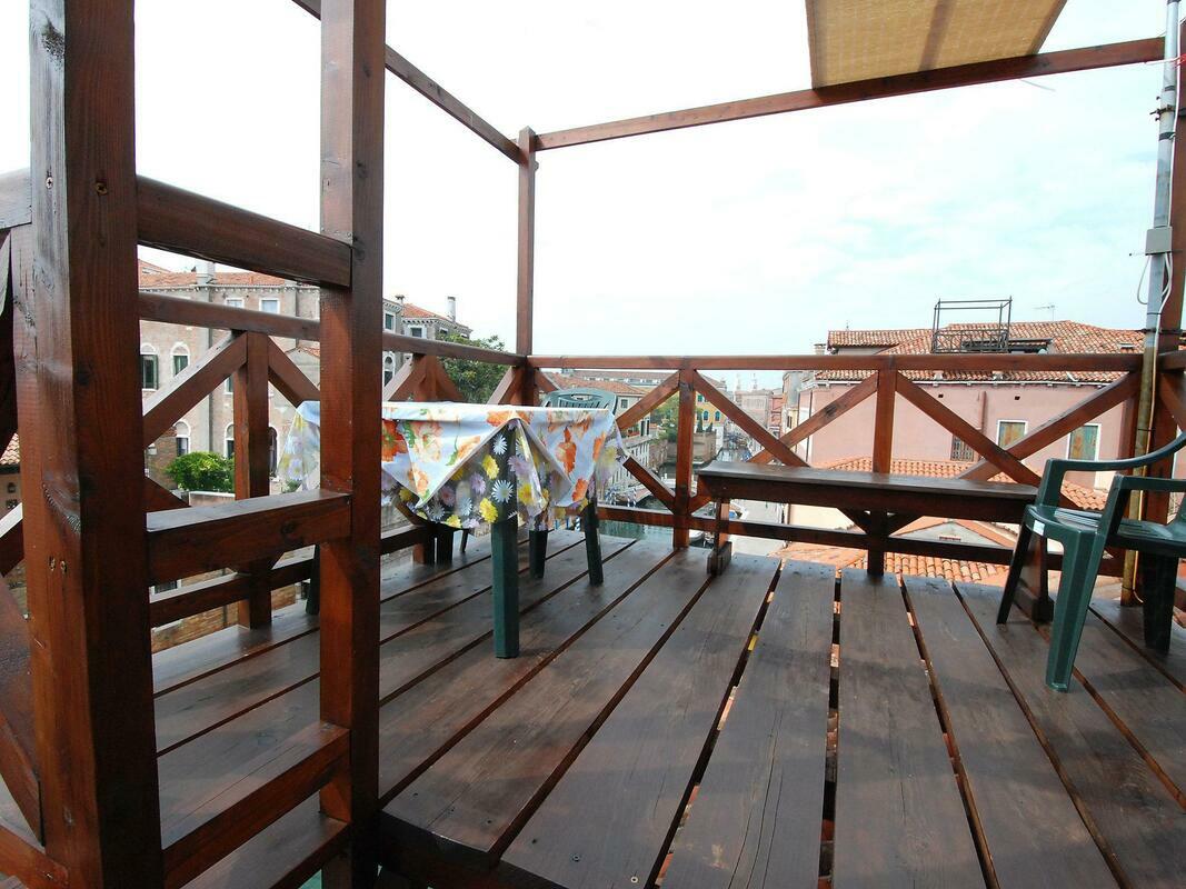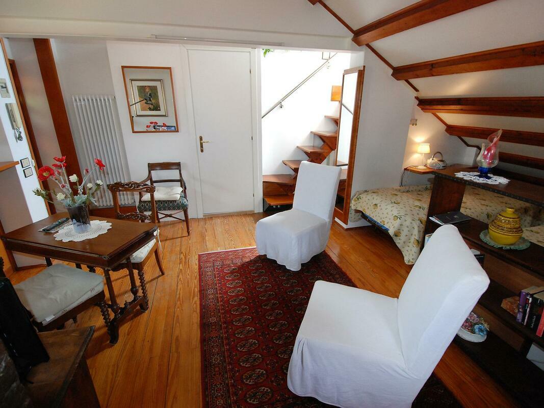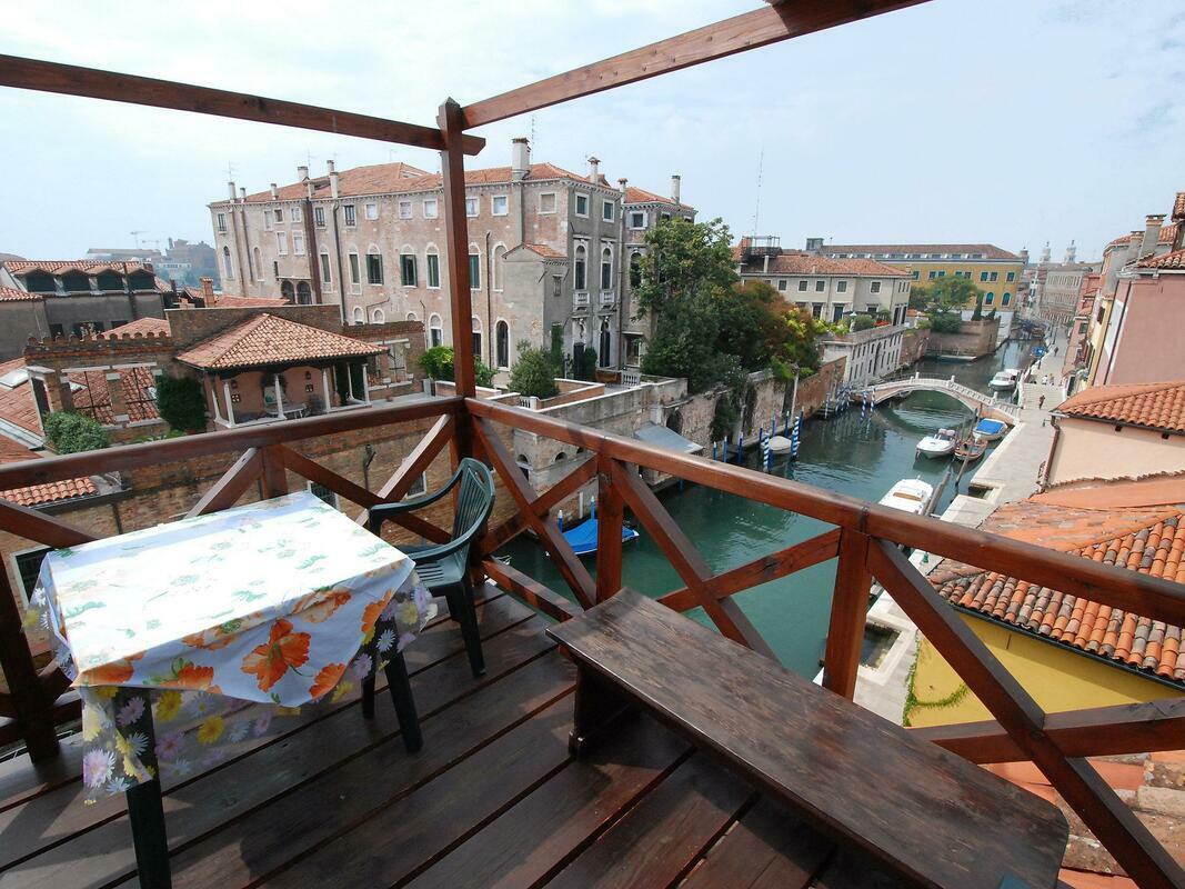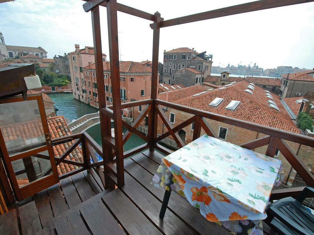 Comfortable small apartment house "Campo San Trovaso", 3 storeys. In the centre of Venezia, in the district Dorsoduro, excellent location: right in the centre but still quiet, directly by the canal, south facing position. Grocery 200 m, supermarket 300 m, restaurant, bar, café 200 m, ferry "Vaporetto stop Zattere" 200 m. Nearby attractions: Gallerie dell'Accademia 200 m, Ponte dell'Accademia 250 m, Museo Peggy Guggenheim 400 m, Piazza San Marco 1.2 km. Please note: There are more similar properties for rent in this same residence. 1-room apartment 45 m2, on the top floor. Renovated in 2009, beautiful and antique furnishings: upper floor: (spiral staircase) living/sleeping room with 2 beds, dining nook and TV (flat screen), radio, CD-player and DVD. Open kitchen (3 hot plates, oven, microwave). Shower/WC. Gas heating. 2nd upper floor: (steep stair). Terrace 7 m2, south facing position. Terrace furniture. Marvellous panoramic view of the canal and the city. Facilities: iron, mosquito net, hair dryer. Internet (WiFi, free). Please note: fire extinguisher. Please note: the apartment is reachable only via narrow spiral staircase, the luggages must be of maximum size 40cm x 35cm x 100cm. Please note: Not suitable for children.