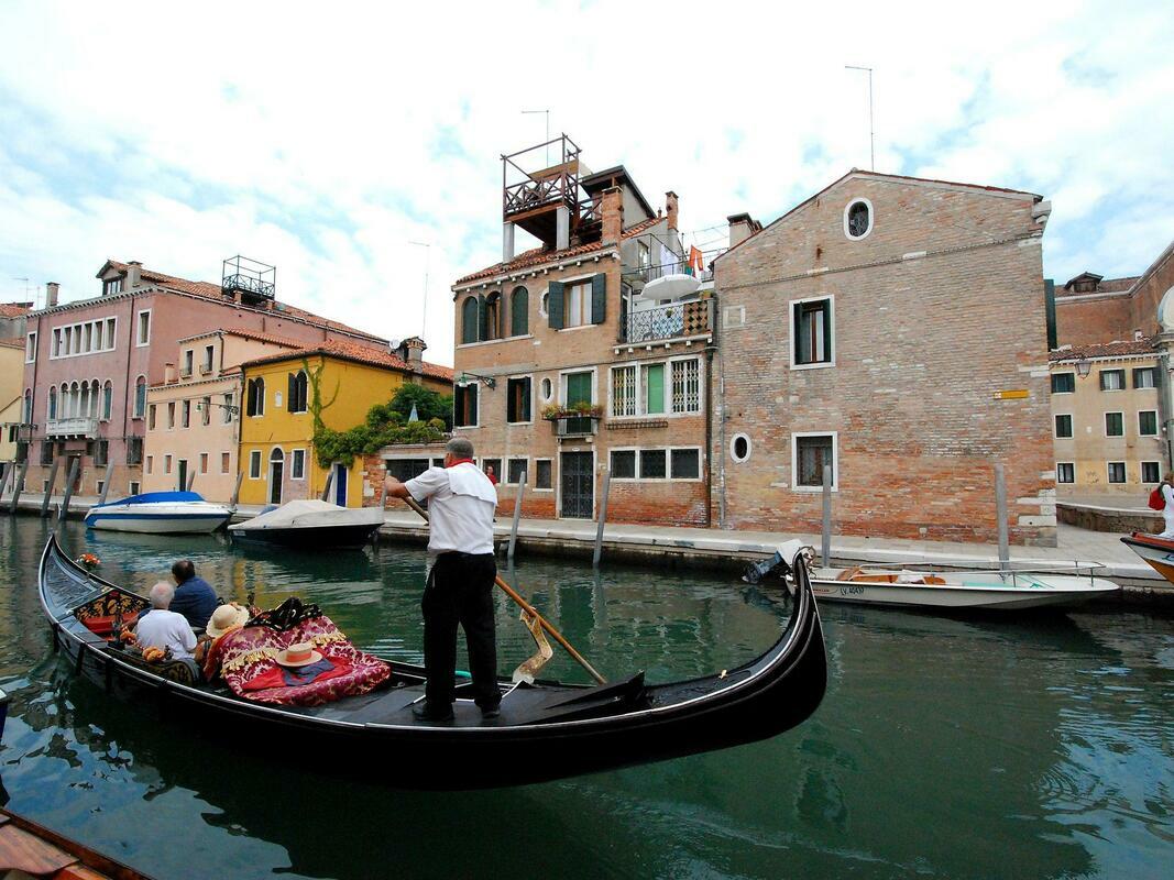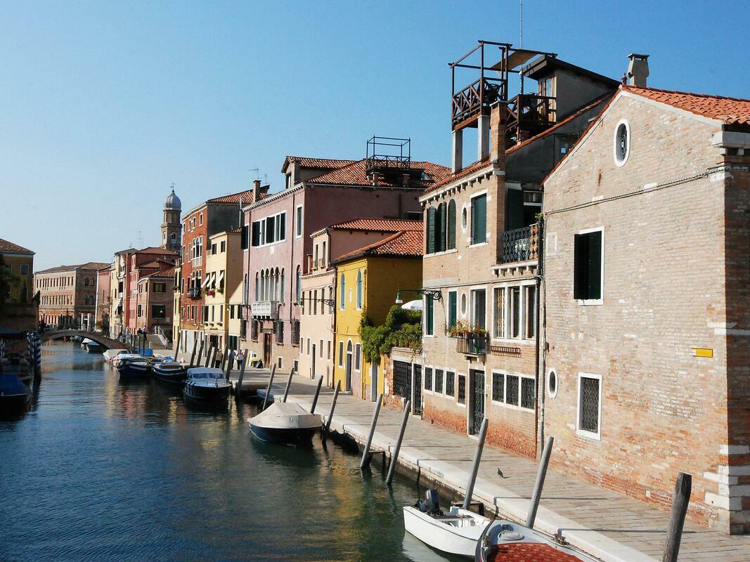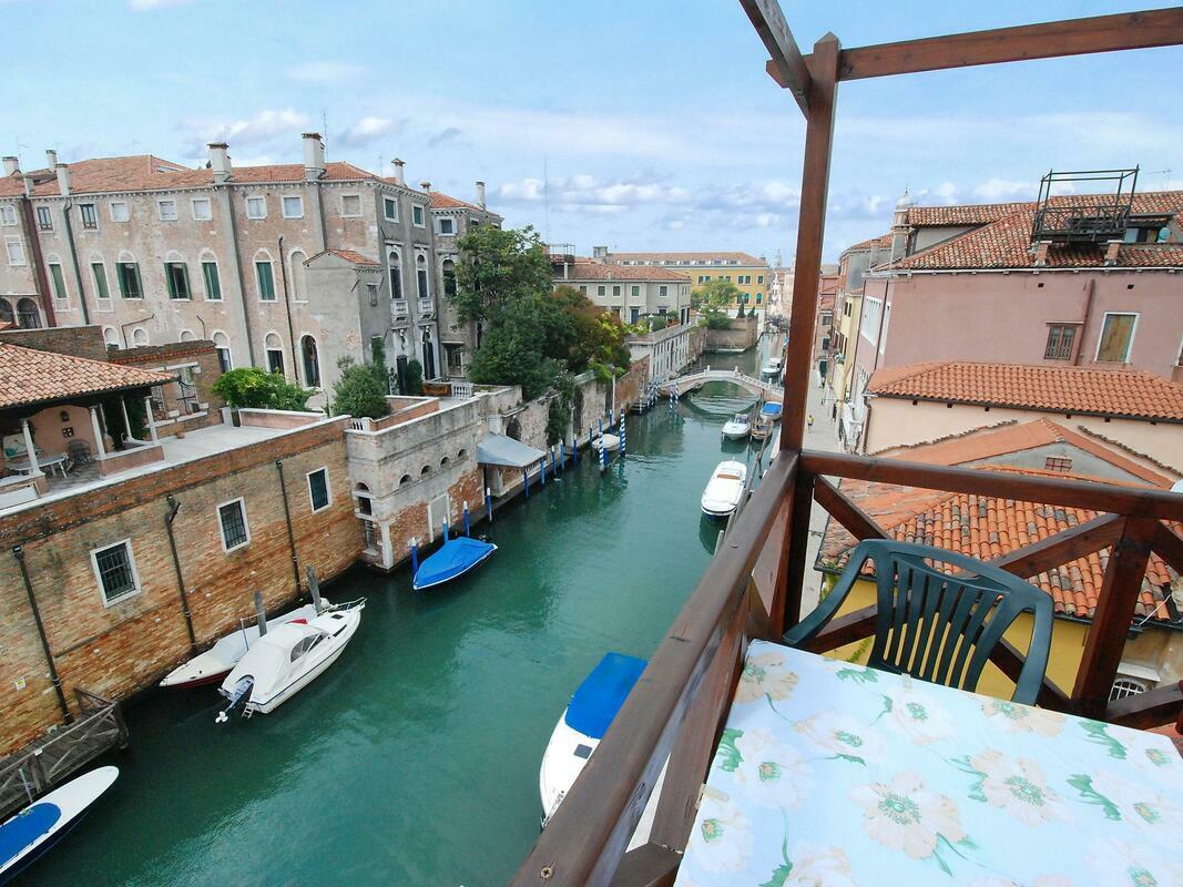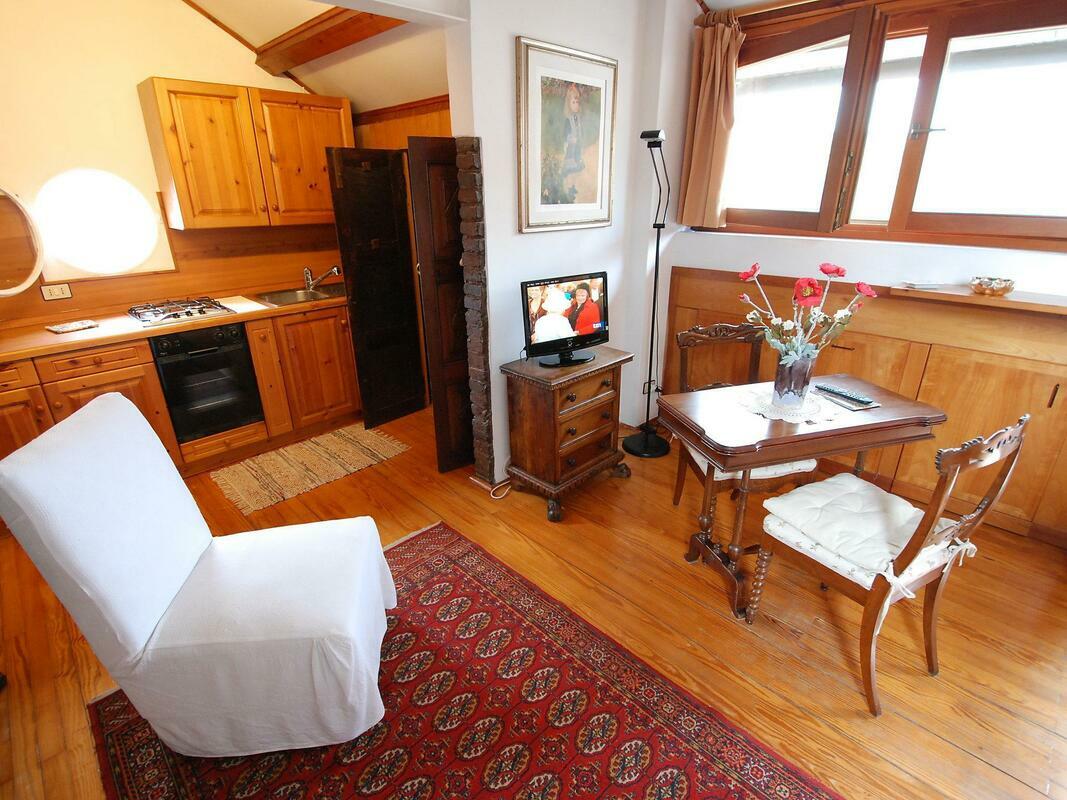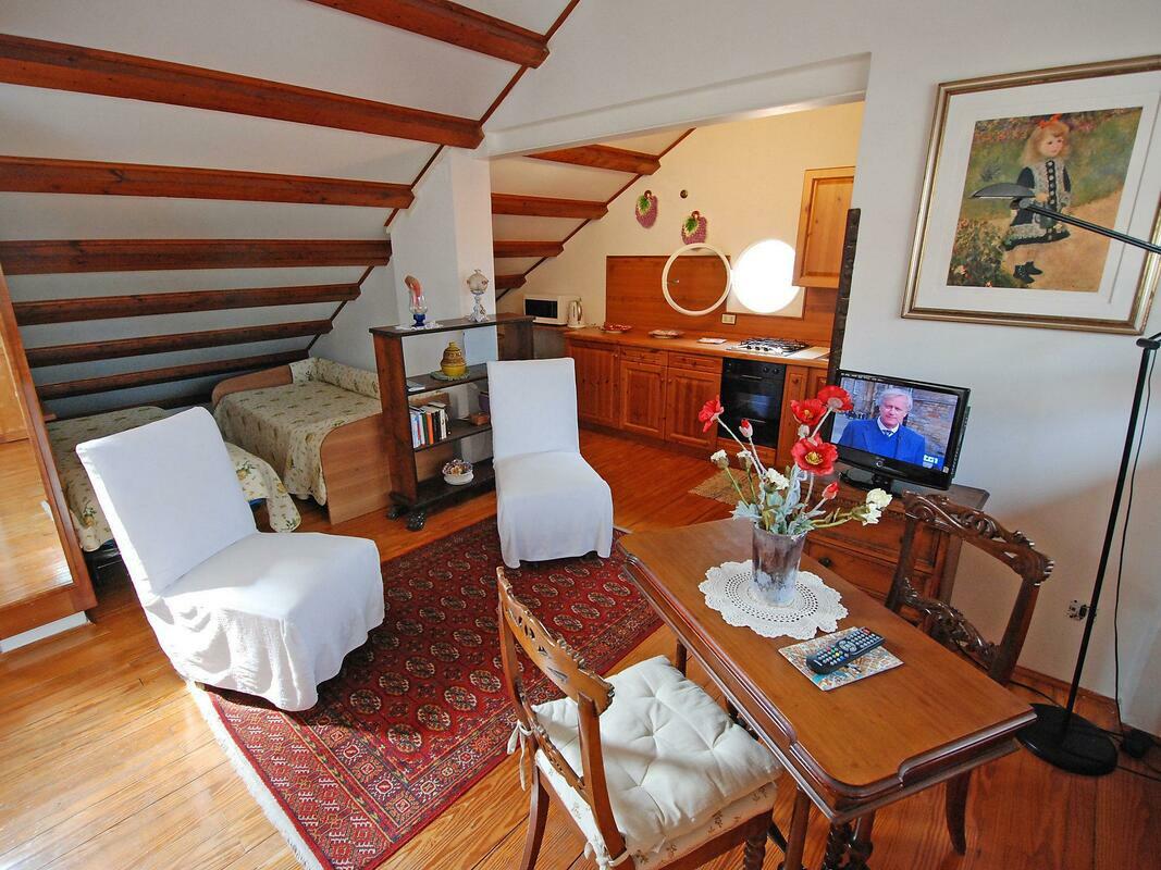 Comfortable small apartment house "Campo San Trovaso", 3 storeys. In the centre of Venezia, in the district Dorsoduro, excellent location: right in the centre but still quiet, directly by the canal, south facing position. Grocery 200 m, supermarket 300 m, restaurant, bar, café 200 m, ferry "Vaporetto stop Zattere" 200 m. Nearby attractions: Gallerie dell'Accademia 200 m, Ponte dell'Accademia 250 m, Museo Peggy Guggenheim 400 m, Piazza San Marco 1.2 km. Please note: There are more similar properties for rent in this same residence. 1-room apartment 45 m2, on the top floor. Renovated in 2009, beautiful and antique furnishings: upper floor: (spiral staircase) living/sleeping room with 2 beds, dining nook and TV (flat screen), radio, CD-player and DVD. Open kitchen (3 hot plates, oven, microwave). Shower/WC. Gas heating. 2nd upper floor: (steep stair). Terrace 7 m2, south facing position. Terrace furniture. Marvellous panoramic view of the canal and the city. Facilities: iron, mosquito net, hair dryer. Internet (WiFi, free). Please note: fire extinguisher. Please note: the apartment is reachable only via narrow spiral staircase, the luggages must be of maximum size 40cm x 35cm x 100cm. Please note: Not suitable for children.