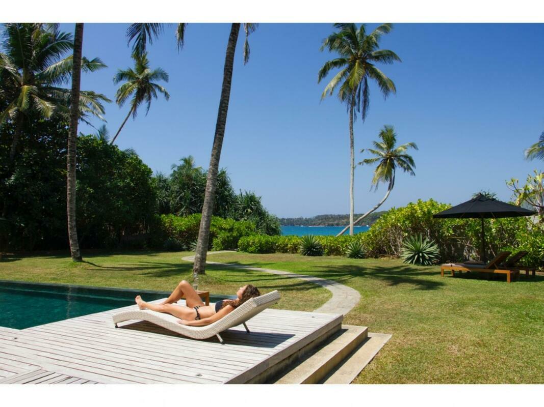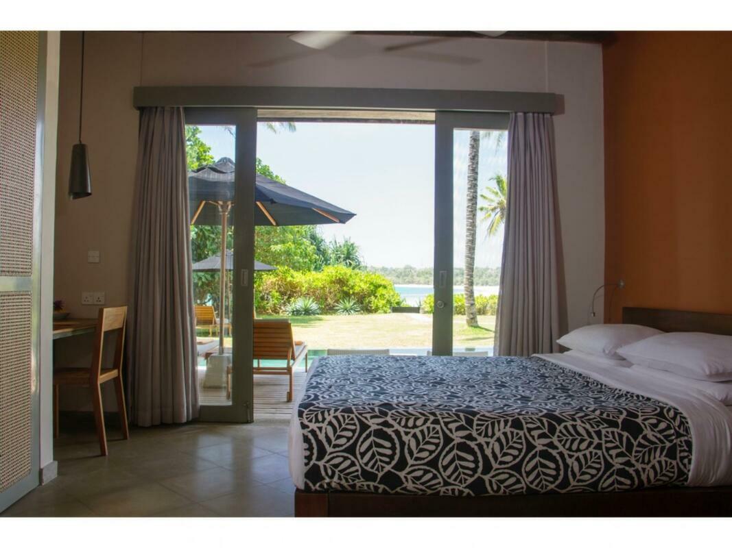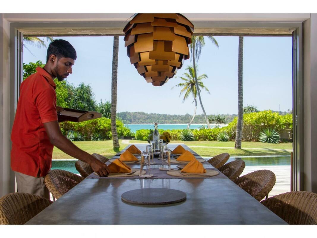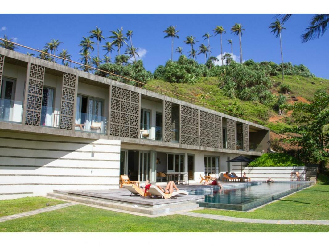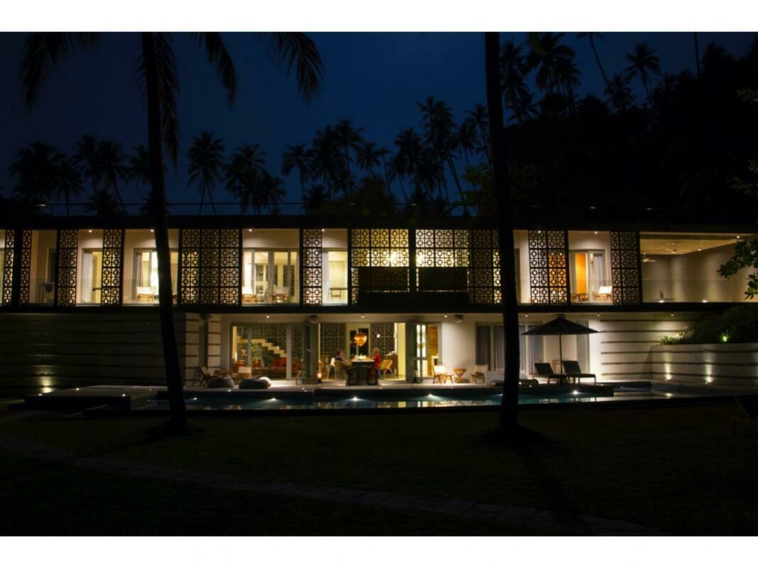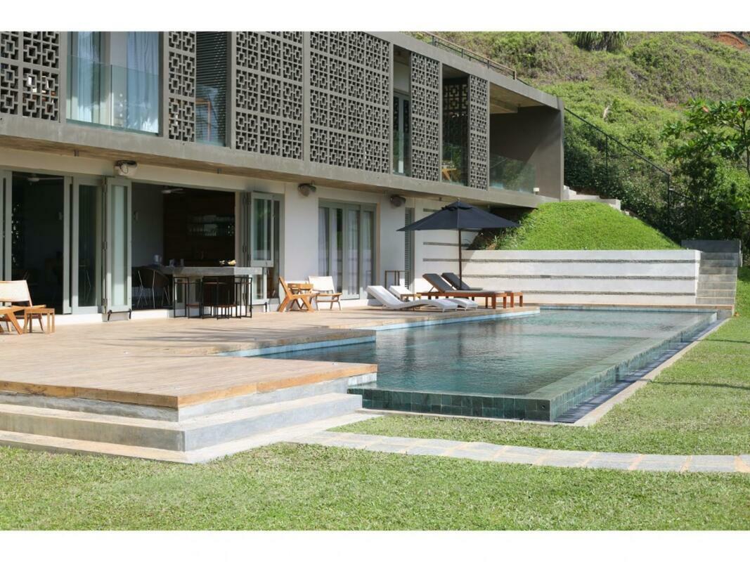Talalla House, tucked into a hill with breath taking views & direct access to one of the most beautiful southern beaches in Sri Lanka, sleeps 14 people, in 7 en suite bedrooms. 5 of the bedrooms are in the main house & the her 2 are accessed from the garden. Enter the architecturally modern Talalla House via a labyrinth where sunlight passes through slits in the wall to light up a tropical fishpond. Hear the ocean as you walk the long hall, past the kitchen, into the open living area. From here, all eyes are drawn to the highlight of Talalla, the golden sandy beach stretching away from you for a kilometre. It is framed by the pool’s infinity edge and a lush tropical garden. The living area is open plan with a dining table for up to 14 people - 10 seated in the house & 4 outside on the pool deck. The entire living area opens to the deck and pool. On the ground floor adjoining the living area, is one of the 5 main house suites en suite bedroom. It has sliding doors that open to the pool deck. From the living area, a floating stairway takes you to the first floor hallway with access to the remaining four bedrooms. All come with air-conditioning & private balconies that offer undisturbed ocean views. The master & second suite both have bathtubs on the balconies. At the end of the hall you enter the covered, open air yoga studio facing the ocean. If you wish, this area can also function as a private covered terrace for the master suite. From here take the stairway to the rooftop with its 30 m (100 ft) long garden from where you look westerly over the beach & the open ocean. The rooftop garden has a small bar and lounge chairs for sunset drinks. Back at the ground floor, walk past the pool & across the garden to the entrance of two smaller garden rooms, each with air con, en suite shower. We'd suggest these rooms are perfect for teenagers. There is also an outside dining table under the shade of trees. At the back of the house you’ll find the staff quarters. Talalla House has a 24/7 security guard and a gated parking area. NB: Meals are offered on a full board and it is USD 45 per day per adult and USD 22.5 per day per child 12 - 5