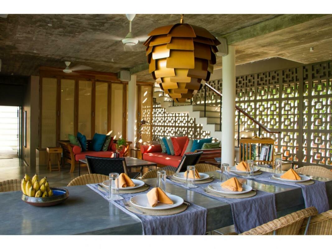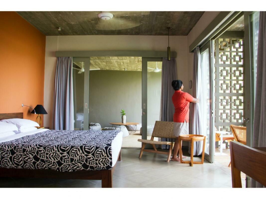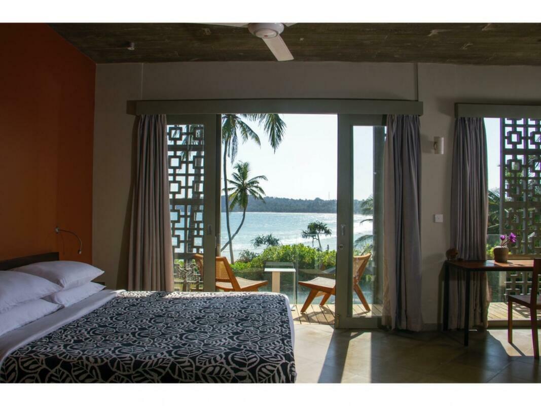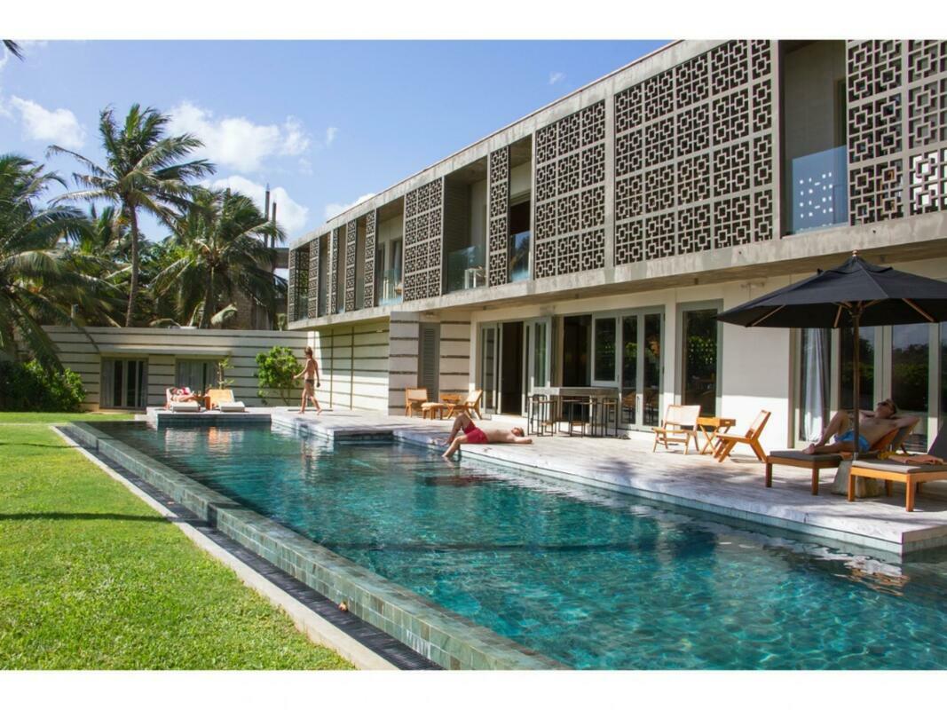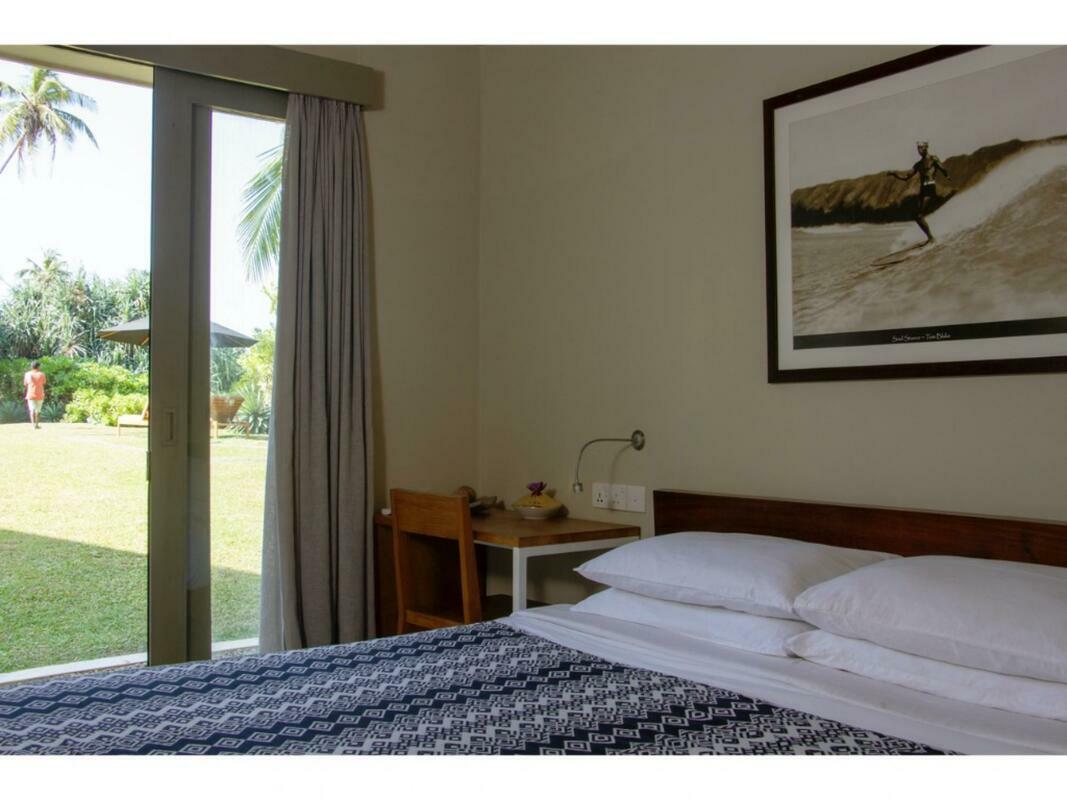 Talalla House, tucked into a hill with breath taking views & direct access to one of the most beautiful southern beaches in Sri Lanka, sleeps 14 people, in 7 en suite bedrooms. 5 of the bedrooms are in the main house & the her 2 are accessed from the garden. Enter the architecturally modern Talalla House via a labyrinth where sunlight passes through slits in the wall to light up a tropical fishpond. Hear the ocean as you walk the long hall, past the kitchen, into the open living area. From here, all eyes are drawn to the highlight of Talalla, the golden sandy beach stretching away from you for a kilometre. It is framed by the pool’s infinity edge and a lush tropical garden. The living area is open plan with a dining table for up to 14 people - 10 seated in the house & 4 outside on the pool deck. The entire living area opens to the deck and pool. On the ground floor adjoining the living area, is one of the 5 main house suites en suite bedroom. It has sliding doors that open to the pool deck. From the living area, a floating stairway takes you to the first floor hallway with access to the remaining four bedrooms. All come with air-conditioning & private balconies that offer undisturbed ocean views. The master & second suite both have bathtubs on the balconies. At the end of the hall you enter the covered, open air yoga studio facing the ocean. If you wish, this area can also function as a private covered terrace for the master suite. From here take the stairway to the rooftop with its 30 m (100 ft) long garden from where you look westerly over the beach & the open ocean. The rooftop garden has a small bar and lounge chairs for sunset drinks. Back at the ground floor, walk past the pool & across the garden to the entrance of two smaller garden rooms, each with air con, en suite shower. We'd suggest these rooms are perfect for teenagers. There is also an outside dining table under the shade of trees. At the back of the house you’ll find the staff quarters. Talalla House has a 24/7 security guard and a gated parking area. NB: Meals are offered on a full board and it is USD 45 per day per adult and USD 22.5 per day per child 12 - 5
