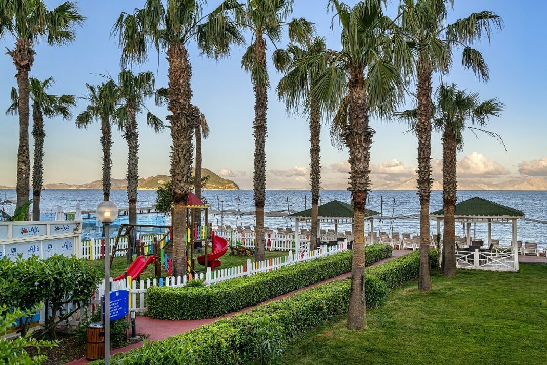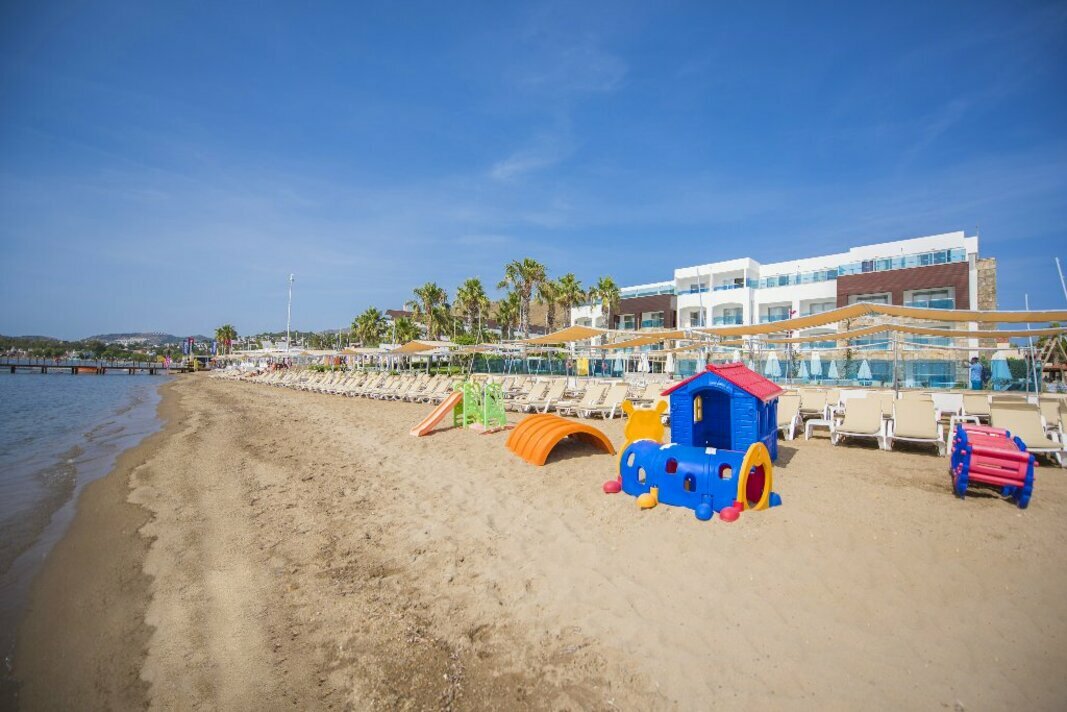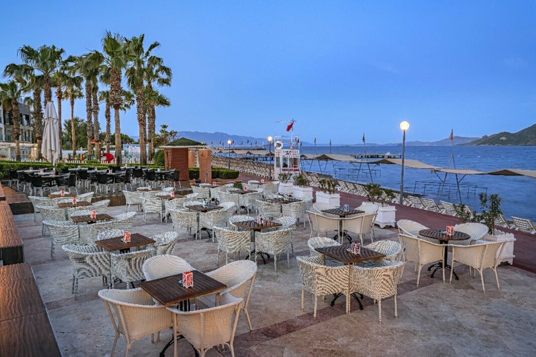 в 55 км от аэропорта и в 22 км от центра г. Бодрум, в поселке Тургутрейс, на берегу моря.