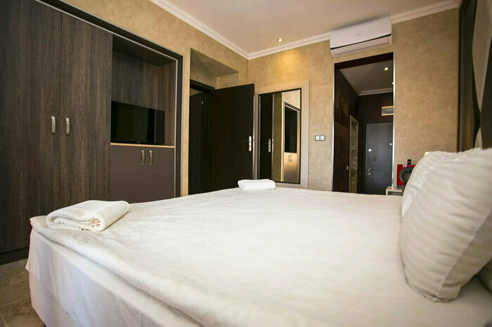 Studio Standard – Suprafață de 38 m². Include aer condiționat, balcon, Wi-Fi, TV, minibar, seif, cadă/duș, articole de toaletă și uscător de păr. Există living, 1 dormitor, 1 pat dublu mare și canapea. Capacitate maximă: 3+0.