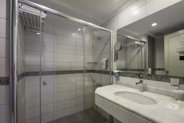 Cameră Economy (Clădirea principală) – Suprafață de 20-22 m². Include aer condiționat, mobilier de grădină, minibar (reumplere gratuită), Wi-Fi, pardoseală: gresie ceramică / laminat, fierbător electric, facilități pentru prepararea ceaiului și cafelei, duș, noptiere, oglindă, articole de baie, garderobă, televizor cu ecran plat prin satelit, seif, uscător de păr, room service (contra cost), telefon (apel direct), birou, curățenie în cameră, schimbarea lenjeriei și prosoapelor. Unele opțiuni pot varia în funcție de categoria camerei și pot fi oferite contra cost. Număr persoane: 3 / 2+1.