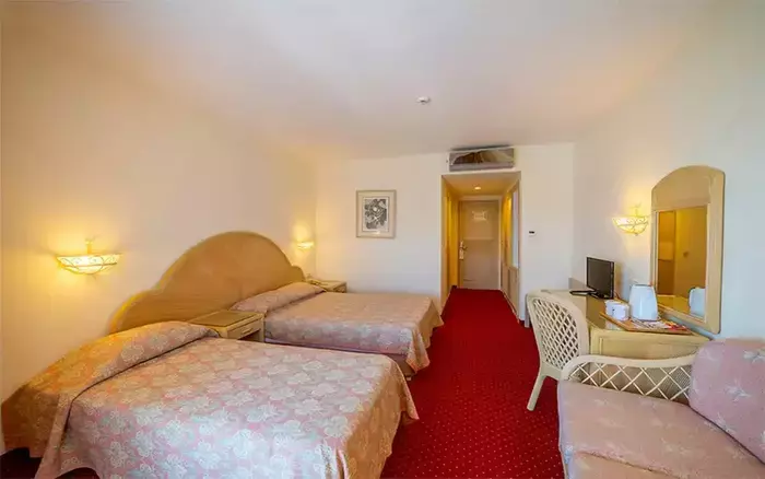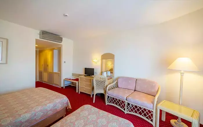 Cameră Economy (Clădirea Annex) – Suprafață de 20-22 m². Include aer condiționat, mobilier de grădină, minibar (reumplere gratuită), Wi-Fi, pardoseală: gresie ceramică / laminat, fierbător electric, facilități pentru prepararea ceaiului și cafelei, duș, noptiere, oglindă, articole de baie, garderobă, televizor cu ecran plat prin satelit, seif, uscător de păr, room service (contra cost), telefon (apel direct), birou, curățenie în cameră, schimbarea lenjeriei și prosoapelor. Unele opțiuni pot varia în funcție de categoria camerei și pot fi oferite contra cost. Număr persoane: 3 / 2+1.