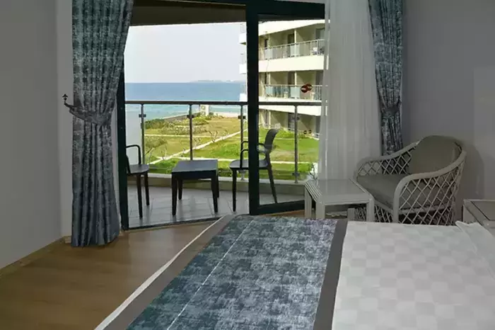 Cameră Standard cu vedere la mare – Suprafață de 20-22 m². Include aer condiționat, ieșire la balcon / terasă, mobilier de grădină, minibar (reumplere gratuită), Wi-Fi, pardoseală: gresie ceramică / laminat, fierbător electric, facilități pentru prepararea ceaiului și cafelei, duș, noptiere, oglindă, articole de baie, garderobă, televizor cu ecran plat prin satelit, seif, uscător de păr, room service (contra cost), telefon (apel direct), birou, curățenie în cameră, schimbarea lenjeriei și prosoapelor. Unele opțiuni pot varia în funcție de categoria camerei și pot fi oferite contra cost. Număr persoane: 2+1.
