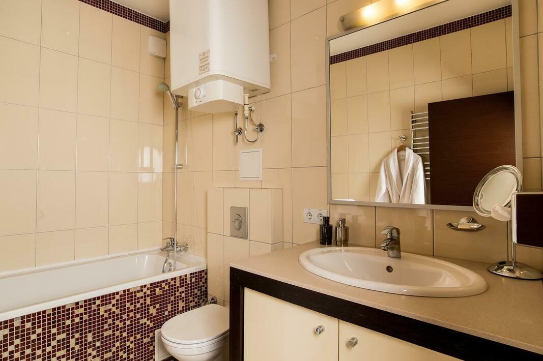 Air conditioning and central heating ensure that rooms maintain comfortable temperatures. A balcony is included as standard in some rooms. All rooms are carpeted and include a double bed or a king-size bed. Separate bedrooms are available. A safe and a minibar are also available. For self-catering guests, there is a well-equipped kitchenette with a refrigerator, mini fridge, stovetop, microwave and tea/coffee station. Other amenities available include a washing machine and an ironing set. A direct dial telephone, a television with satellite/cable channels, a stereo system and WiFi provide all the essentials for a comfortable holiday. Slippers are included. A hairdryer and bathrobes are available in the bathrooms, which are equipped with a shower and a bathtub. The hotel has 16 non-smoking rooms.