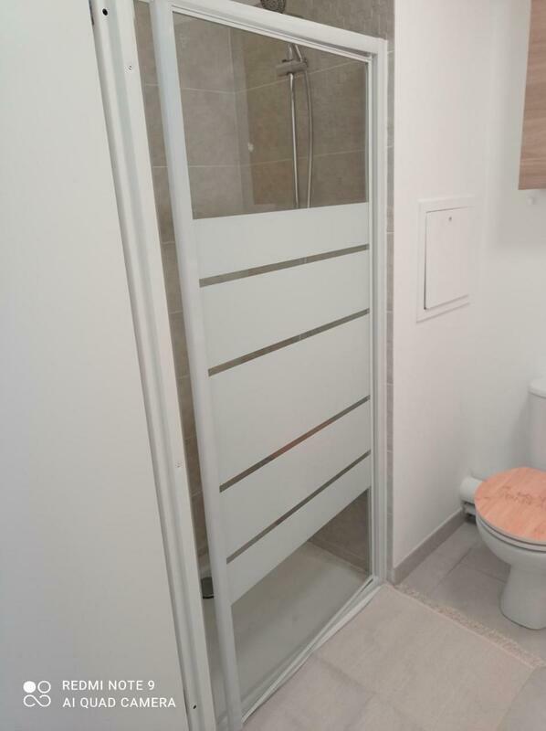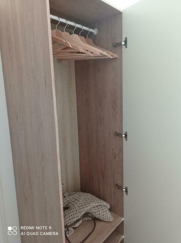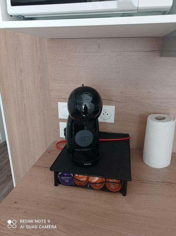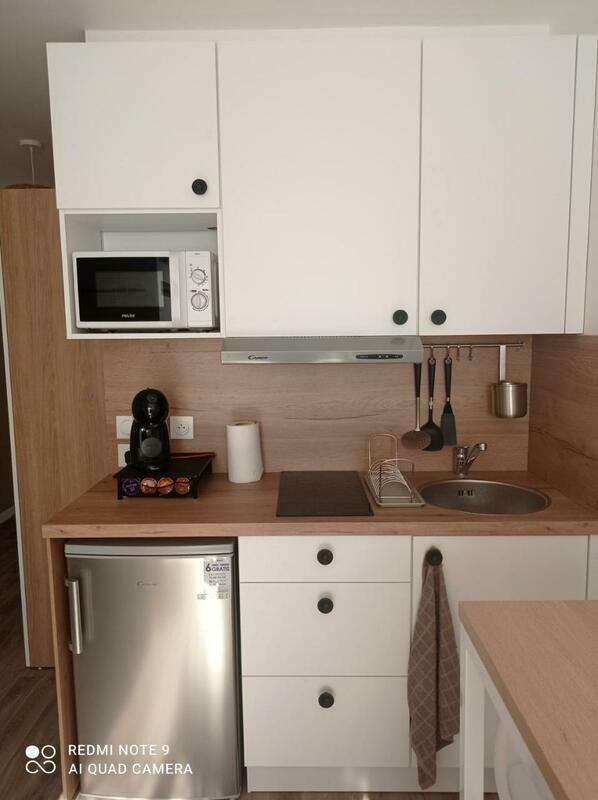 The apartment includes a kitchen with a fridge and a microwave, as well as a coffee machine. Towels and bed linen are featured in the apartment.