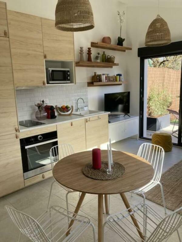 The holiday home is equipped with 1 bedroom, 1 bathroom, bed linen, towels, a flat-screen TV with streaming services, a dining area, a fully equipped kitchen, and a terrace with garden views.