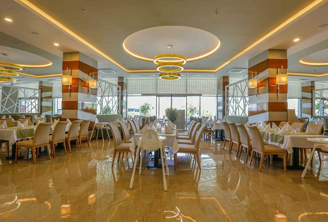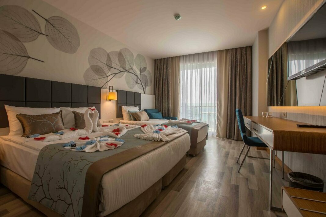 Современный курортный отель в Анталии на первой линии открылся в 2017 году и состоит из главного здания высотой в 6 этажей и 5-этажного корпуса. Остановиться можно в любом из 332 номеров, каждый из которых элегантно и со вкусом оформлен. К услугам постояльцев всевозможные удобства, кондиционер и ЖК-телевизор со спутниковыми каналами. На просторной территории площадью 11000 м2 разбит основной бассейн с террасой для загара, бассейн с горками и крытый, спа-салон, открыто несколько баров и ресторанов с блюдами местной и интернациональной кухни и напитками, а также организованы места отдыха. Для детей ежедневно организовываются анимационные программы и мероприятия в мини-клубе, а также открыты отдельные бассейны и игровые зоны. Для молодоженов, проводящих медовый месяц, есть специальные предложения и действует система бонусов, а для проведения конференций оборудовано два больших зала.