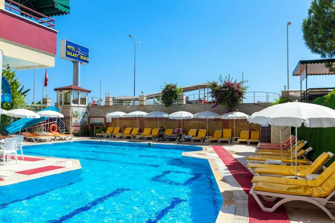 Пляжный отель в Алании 4 звезды на первой линии впервые был открыт в 2002 году, где в 2015 году была проведена последняя масштабная реновация. На небольшой территории площадью 3800 м2 находится два пятиэтажных корпуса, насчитывающих 116 комфортабельных стандартных номеров. Комнаты выполнены в приятных бирюзово-белых оттенках, из 75 открывается великолепный вид на море. Питание гостей производится в основном ресторане, а в барах на протяжении всего дня подают освежающие и горячие напитки. В свободное время отправьтесь позагорать на частный пляж или на террасу возле бассейна, после чего сыграйте партию в настольный теннис или уделите себе внимание, отправившись на массаж. Также, всего в 14 км от отеля находится центр Алании с его исторической крепостью, Кызыл Куле (Красной башней) и пещерой Дамлаташ. Любителям спокойного отдыха стоит посетить живописный парк Махмутлара или прогуляться вдоль набережной, заглядывая в уютные кафе. Поблизости находятся магазины, рынок и рестораны с местной кухней, что будет особенно оценено гурманами. Для молодоженов, проводящих в отеле медовый месяц, действуют специальные предложения, о которых расскажет администратор. В отзывах о Galaxy Beach Hotel туристы часто отмечают приветливость персонала, вкусное и полноценное питание, а также чистоту территории и номеров.