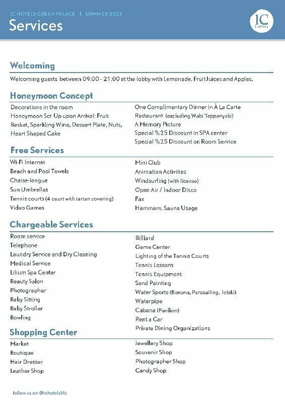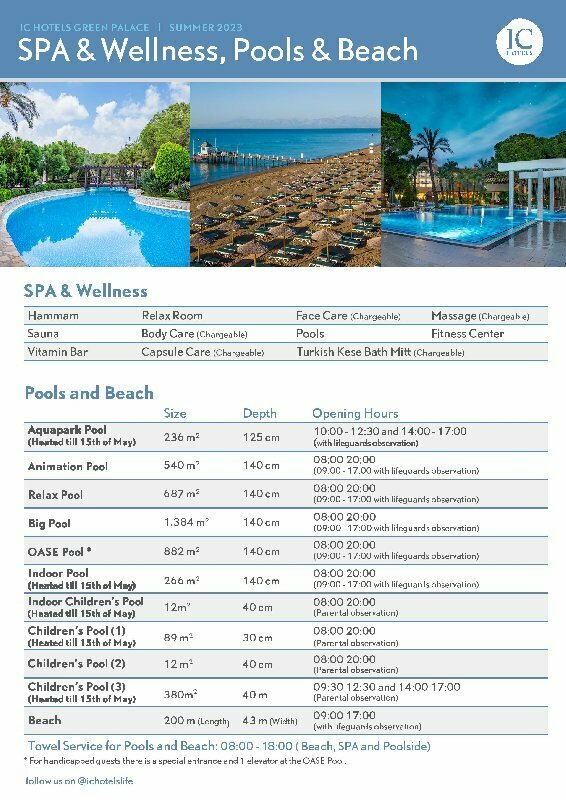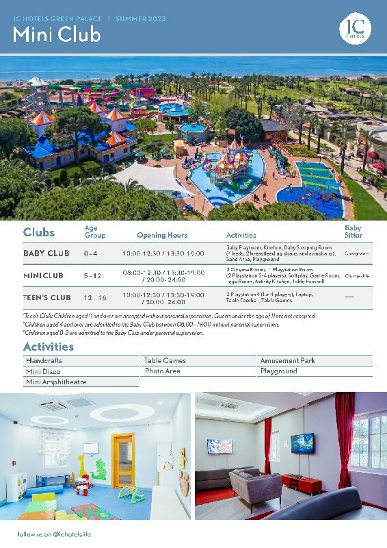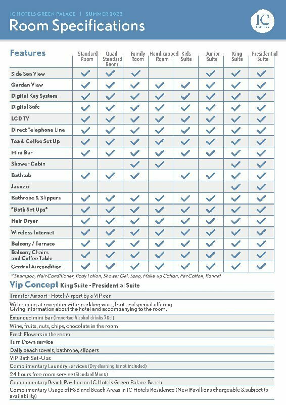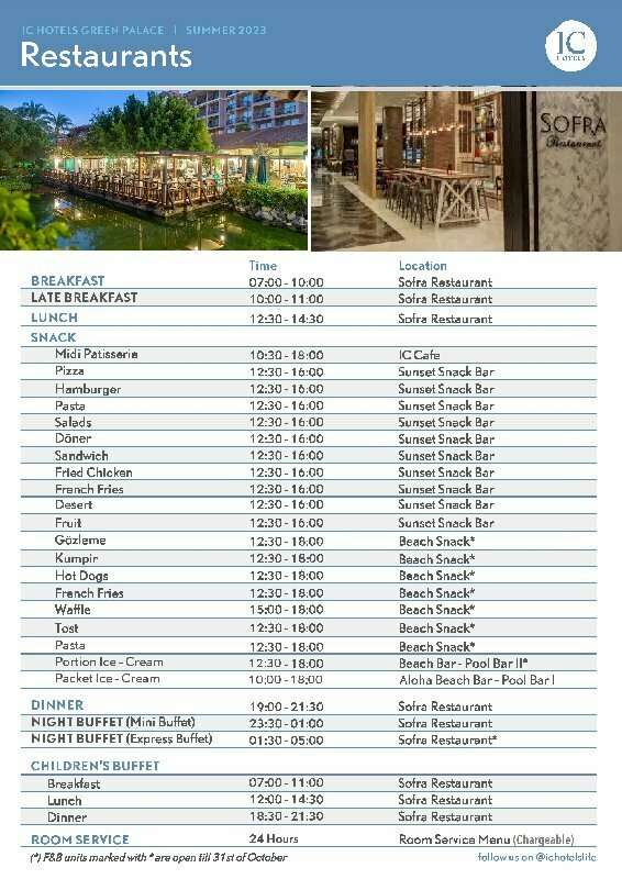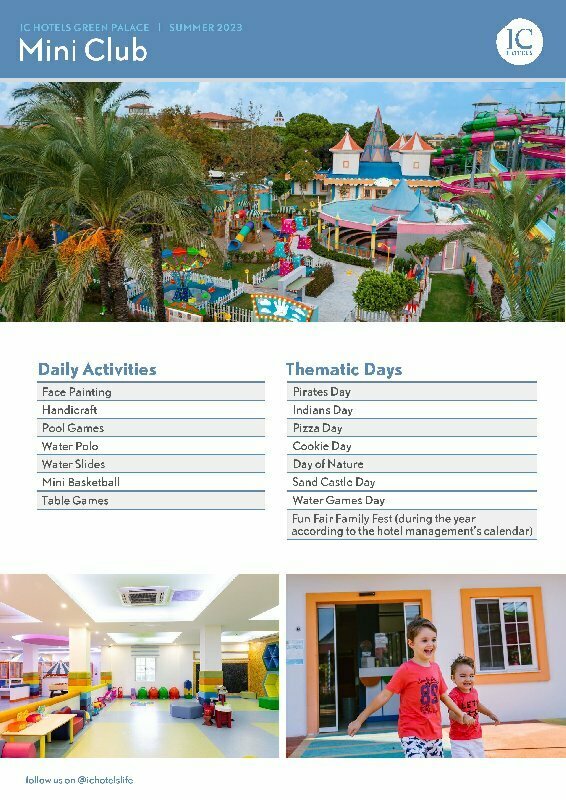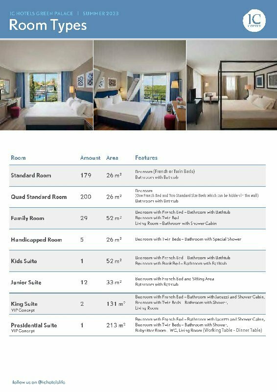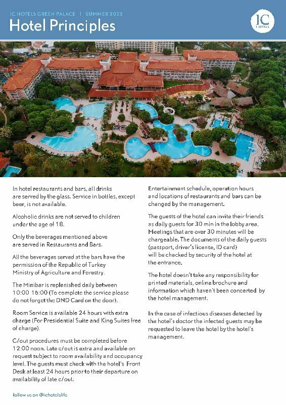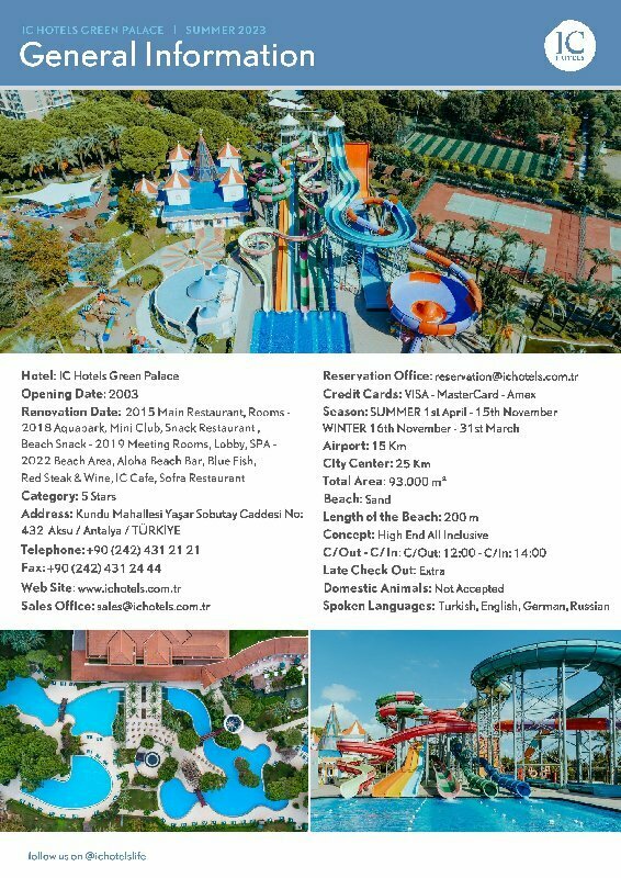 Забронировать номер в отеле IC Hotels Green Palace можно уже сейчас, позвонив по номеру телефона или заполнив форму на сайте. Менеджеры помогут подобрать тур в отель под ваш бюджет, проконсультируют по возникшим вопросам и постараются сделать все возможное, чтобы семейный отдых в Анталии запомнился надолго!