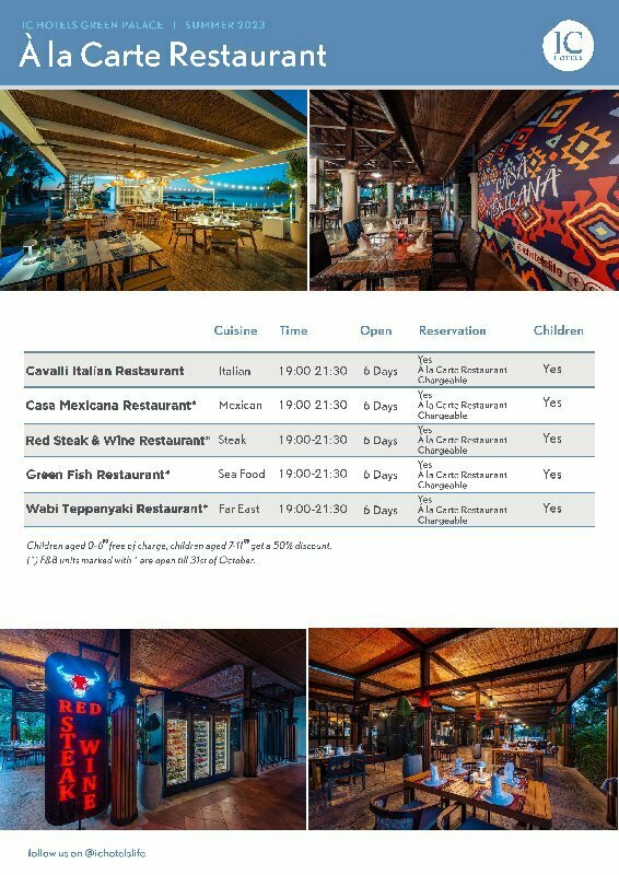 Гости также могут поужинать в одном из a-la carte ресторанов, предварительно забронировав столик. Обслуживание в каждом из них является платным.